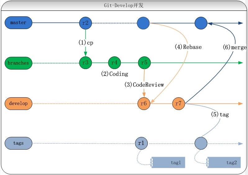 Git-Develop 分支模式是基于 Git 代码库设计的一种需要严格控制发布质量和发布节奏的开发模式。develop 作为固定的持续集成和发布分支,并且分支上的代码必须经过 CodeReview 后才可以提交到 Develop 分支。它的基本流程如下: