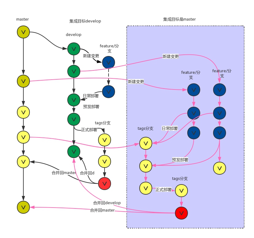 - 能支持日常迭代开发、紧急线上bug修复、多功能并行开发