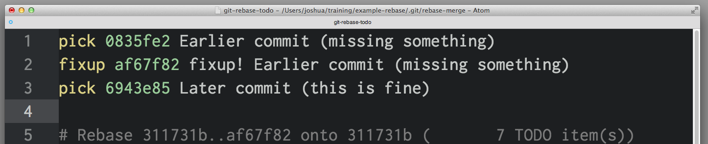 如果你不想提前写一些消息的话,你也可以使用git commit --fixup。在这个场景中,最好使用commit --fixup,因为在rebase过程中,你仅仅想要使用早期提交的消息。
