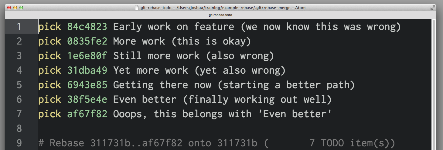 当你保存并且推出编辑器,GIT将会按顺序从上到下应用你的提交。你可以改变提交顺序。如果你想,你可以通过调整顺序合并 af67f82 和 0835fe2,就像这样: